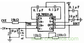 信號放大電路采用ICL7653斬波穩零運算放大器來 完成,如圖2所示。ICL7653具有極低的失調電壓和偏置電流,具有較高的工作穩定性和優良的高精度放大功能。ICL7653斬波穩零使用內部時鐘時, 在CA、CB與CR端之間加上0.1 μF的低泄放、高穩定性的聚酯或聚丙烯電容。同時在雙電源接入端進行濾波和去耦處理。