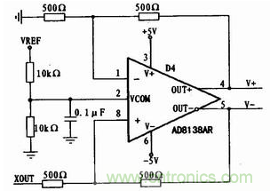 如圖3所示,差分轉換電路以AD8138AR為核心,將單端信號轉換差分信號,既可以提高共 模抑制比,有效減小共模信號影響,又可以驅動SOC內部的24位差分Sigma-Delta模/數轉換器。AD8138AR具有較寬的模擬帶寬(320 MHz,-3 dB。增益為1時),而且AD8138AR為表面封裝器件,器件體積小,使得ADC與信號輸入點的距離可以很近,大大減少了外界噪聲的影響。
