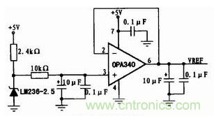 MEMS傾角傳感器SCA100T在傾角為0°時,模擬輸出為其電源電壓的1/2倍,如果傾角傳感器電源電壓有波動,則其輸出會產生相應的波 動。因此設計時,將給模數轉換電路提供基準源的輸出(如圖4所示),經過提高驅動能力后,提供給MEMS傾角傳感器SCA100T作電源(如圖5所示)。 一方面,基準源輸出紋波極小,且性能穩定;另一方面,模數轉換器的基準源和MEMS傾角傳感器SCA100T的電源同時向相同方向變化,抵消了MEMS傾 角傳感器因電源引起零點漂移的影響。