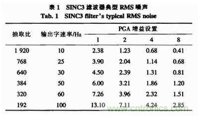 從表1可知,較高的抽取比需要較長的轉換周期,即輸出字速率較低,但具有較低噪聲。