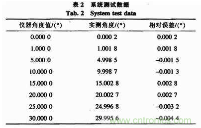 從表2的測試數據可知,每個測試點的偏差有正有負,其主要原因在于這些測試點的曲線擬合是獨立的,互不影響。另外,在30°時絕對誤差最大,最大的絕對誤差為0.0044°,在1°時相對誤差最大,為0.001 8/1≈0.018%。