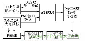 本系統采用全閉環控制方式,如下圖圖2,將鼠標檢測到位移增量反饋回單片機,并進行數字式PID控制,運算結果通過D/A轉換芯片傳給變頻器,從而控制電機的轉速。