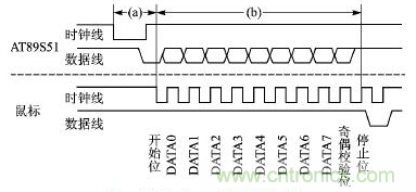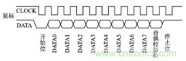 鼠標履行一種雙向同步串行通信協議,在時鐘信號的作用下串行發送或者接受數據。通常情況下,單片機在總線上具有總線控制優先權,可在任何時候抑制來自于鼠標的通信。從鼠標到單片機的數據在時鐘的下降沿被讀取,相反,單片機到鼠標的數據在時鐘的上升沿被讀取。時鐘信號總由鼠標內部芯片提供,時鐘頻率一般在10~20KHz。