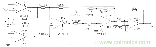 放大處理后的電壓信號,雖然在幅值上達(dá)到了可以處理的范圍,但模/數(shù)電壓轉(zhuǎn)換的范圍是0~5 V,而傳感器輸出的電壓存在負(fù)值,為了使電壓匹配,信號電壓在接人模/數(shù)轉(zhuǎn)換器前可以加一級加法電路,將電壓信號全部轉(zhuǎn)換為正值。放大電路、濾波電路和加法電路均使用LM324實(shí)現(xiàn),硬件電路如圖4所示。