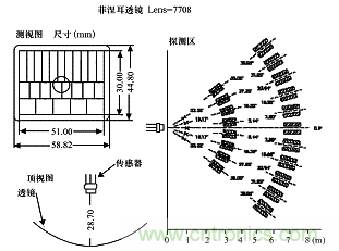 菲涅耳透鏡(圖3)根據(jù)菲涅耳原理制成,把紅外光線分成可見區(qū)和盲區(qū),同時(shí)又有聚焦的作用,使熱釋電人體紅外傳感器 (PIR) 靈敏度大大增加。菲涅耳透鏡折射式和反射式兩種形式,其作用一是聚焦作用,將熱釋的紅外信號(hào)折射(反射)在PIR上;二是將檢測區(qū)內(nèi)分為若干個(gè)明區(qū)和暗區(qū),使進(jìn)入檢測區(qū)的移動(dòng)物體能以溫度變化的形式在PIR上產(chǎn)生變化熱釋紅外信號(hào),這樣PIR就能產(chǎn)生變化電信號(hào)。