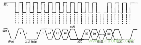 AD7416采用I2C串行總線和數據傳輸協議來實現同外設的數據傳輸。在數據傳輸過程中AD7416作為從器件通過數據輸入/輸出線SDA以及時鐘信號線SCL與總線相連。其傳輸時序如圖3所示。當SCL保持高電平時,SDA從高電平到低電平的跳變為數據傳輸的開始信號,隨后傳送AD7416的地址信息的讀/寫控制位。其地址信息的格式為:100A2A1A0R/W。