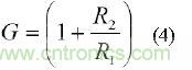 其中, VIN(MAX)為傳感器預期的最大失調。等式(5)同時顯示, 調整電路的插入會修改從輸入到輸出的增益。即使如此,其影 響一般也很小,增益可以重新計算為: