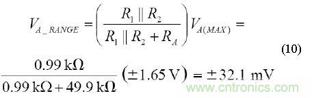 由于DAC可以擺動±1.65 V,因此,總失調調整范圍可通過由RA 以及R1和R2的并聯(lián)組合形成的分壓器給定,其計算方法如下: