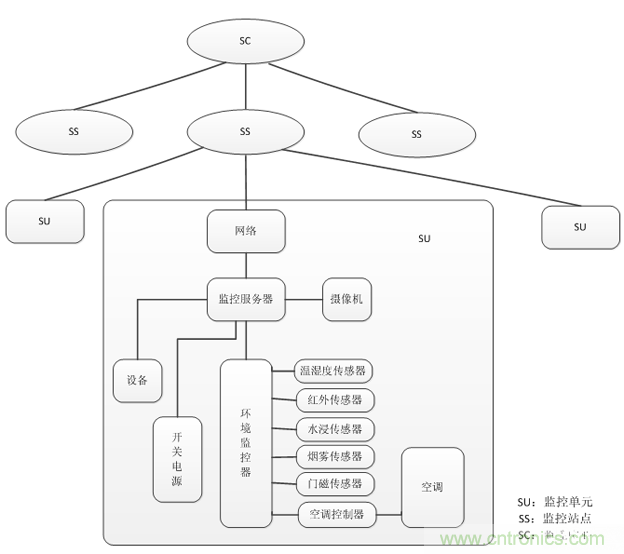 動(dòng)力環(huán)節(jié)監(jiān)測(cè)系統(tǒng)應(yīng)用在機(jī)房、基部站等無人值守的環(huán)境中,對(duì)局站內(nèi)的通訊電源、蓄電池組、UPS、發(fā)電機(jī)、空調(diào)等智能、非智能設(shè)備以及溫濕度、煙霧、地水、門禁等環(huán)境量實(shí)現(xiàn)“遙測(cè)、遙信、遙控、遙調(diào)”等功能。為了實(shí)現(xiàn)對(duì)多個(gè)量的監(jiān)測(cè),動(dòng)環(huán)系統(tǒng)集成了各種類的傳感器,是多傳感器集成系統(tǒng)傳感器“多類型”的一個(gè)經(jīng)典案例。同時(shí),此監(jiān)控系統(tǒng)充分利用了通訊傳輸設(shè)備所能提供的各種傳輸信道資源,可以實(shí)現(xiàn)多級(jí)網(wǎng)管,能夠?qū)λ芯终镜娜珔?shù)、全方位的監(jiān)控,這又很好體現(xiàn)了多傳感器集成系統(tǒng)傳感器“多數(shù)量”的一面。動(dòng)環(huán)監(jiān)測(cè)系統(tǒng)的組成如下: