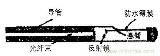 1、壓力測量。目前臨床上應用的壓力傳感器主要用來測量血管內的血壓、顱內壓、心內壓、膀胱和尿道壓力等。用來測量血壓的壓力傳感器示意見圖3。其中對壓力敏感的部分是在探針導管末端側壁上的一塊防水薄膜,一面帶有懸臂的微型反射鏡與薄膜相連,反射鏡對面是一束光纖,用來傳遞入射光到反射鏡,同時也將反射光傳送出來。當薄膜上有壓力作用時。薄膜發生形變且能帶動懸臂使反射鏡角度發生改變,從光纖傳來的光束照射到反光鏡上,再反射到光纖的端點。由于反射光的方向隨反射鏡角度的變化而改變,因此光纖接收到的反射光的強度也隨之變化。這一變化通過光纖傳到另一端的光電探測器變成電信號,這樣通過電壓的變化便可知探針處的壓力大小。