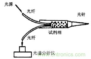 采用光傳感器測量 pH 值的原理,是利用透射光和發(fā)射光的強度隨波長分布光哭進行測定的,在纖維素膜盒中插入兩條光纖,然后將針頭插入血管或者組織中,試劑會和體液混合,吸收特定波長的光,然后使用分析儀將測量這種變化,分析后即可得到組織或者血液的 pH 值。