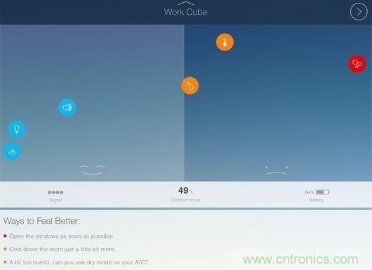 測試人員發現,CubeSensors給出的這些信息較想象中更為有用。例如,產品提示一處起居室的溫度有點低,如果適當提升溫度會讓人感覺更加舒適及放松。而在辦公室中,CubeSensors提示改善光照條件能夠幫助提升工作效率。在臥室中,產品給出了需要開窗以便改善空氣質量的建議。用戶除了查看數據之外,還能看到應用給出的實用建議,例如“盡快開窗”或“提升溫度會讓你感覺更加舒適”。盡管看起來似乎平淡無奇,但CubeSensors背后的團隊表示,通過這些小建議,產品可以幫助用戶避免罹患感冒、過敏、頭疼等癥狀。