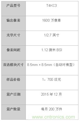 圖2:東芝最小級1600萬像素CMOS圖像傳感器的主要特性