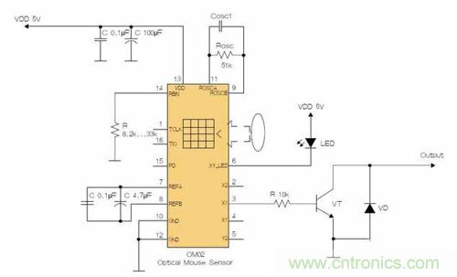 鼠標芯片的CMOS光學傳感器可提供非機械式跟蹤引擎。在該芯片內部可完成圖像的捕獲、數字化和數字處理。就拿簡單且低成本的OM02來說,該傳感器通過采集表面圖像幀來測量位置,并通過數學運算判定運動方向和距離。該傳感器安裝聚苯乙烯光學封裝中,設計用來與高亮度LED一起使用。它有一個完整且緊湊的跟蹤引擎;沒有活動部件,也不要求精密的光學對準。OM02可以為X和Y方向運動產生正交輸出信號。分辨率約為0.0025英寸,運動速度最高為每秒16英寸。