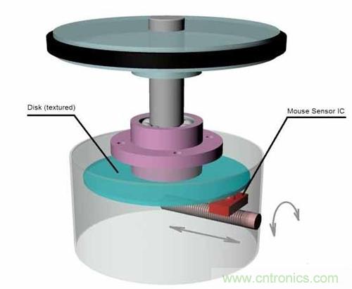 【導讀】本設計實例使用光學電腦鼠標中的傳感器測量圓盤的旋轉,其中的圓盤可以通過機械方式連接到任何一種旋轉裝置。通過沿著圓盤半徑改變傳感器位置,該方案可以調整每次旋轉的脈沖。