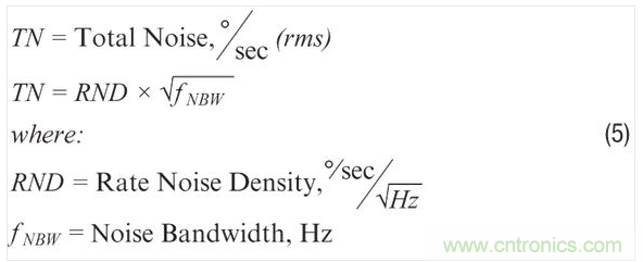 提供連續(xù)指向控制的系統(tǒng)開(kāi)發(fā)者可能更愿意從角速率方面來(lái)評(píng)估噪聲影響,因?yàn)樗麄兛赡軟](méi)有固定的積分時(shí)間來(lái)利用基于ARW的關(guān)系。從角速率方面評(píng)估噪聲常常要考慮RND參數(shù)和陀螺儀信號(hào)鏈的頻率響應(yīng)。對(duì)陀螺儀頻率響應(yīng)影響最大的常常是濾波,其支持環(huán)路穩(wěn)定標(biāo)準(zhǔn)的專(zhuān)用要求,并能抑制對(duì) 環(huán)境威脅(如振動(dòng))的不相干傳感器響應(yīng)。公式5給出了一種簡(jiǎn)單方法來(lái)估算與特定頻率響應(yīng)(噪聲帶寬)和RND相關(guān)的 噪聲。