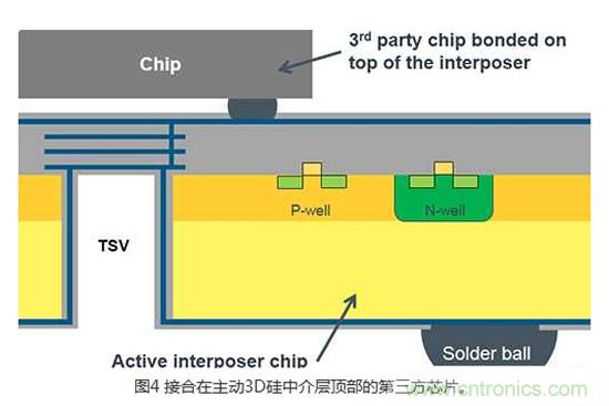 3DIC技術的另一個變化和極為創新的發展,是硅中介層架構(Silicon interposer architecture)。 所謂的被動3D硅中介層是用來產生一個從芯片的頂端到底部的簡單電氣連接。 所謂的主動3D硅中介層能支持實現完整CMOS設計所需制程技術的所有被動和主動組件。