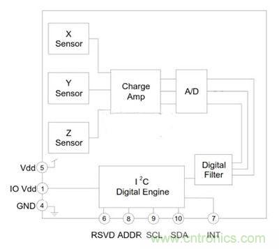 圖2:Kionix公司KXCJ9硅加速度計(jì)容納于在從第二貼合晶片在晶片級(jí)別創(chuàng)建一個(gè)密閉的腔。一個(gè)單獨(dú)的信號(hào)處理ASIC上安裝有傳感元件,以進(jìn)一步降低傳感器的整體尺寸,產(chǎn)生了3&TImes;3&TImes;0.9毫米的LGA塑料封裝從1.8操作 - 3.6伏直流電源。穩(wěn)壓器用于保持對(duì)輸入電源電壓范圍內(nèi)恒定的內(nèi)部工作電壓。這樣,可以通過(guò)輸入電源電壓的范圍內(nèi)穩(wěn)定的工作特性,以從供給變異去除任何錯(cuò)誤,并消除了對(duì)外部電源調(diào)節(jié),進(jìn)一步降低了設(shè)計(jì)的整體尺寸。