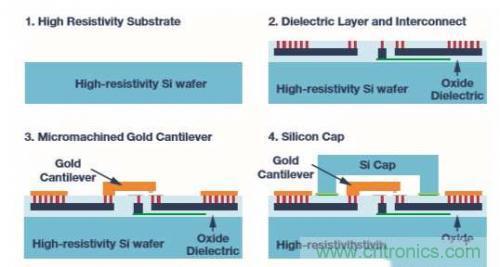 圖二中所示為利用MEMS技術制造開關的四個主要步驟。 該開關是以高電阻率的硅芯片(具有沈積在頂部的厚電介質層以提供與下方基板的優越電氣隔離)所建構。 使用了標準的后端CMOS內部鏈接制程實現與MEMS開關的內部鏈接。 低電阻率金屬與多晶硅都被用來制作與MEMS開關的電氣鏈接,而且都被嵌入至電介質層當中。