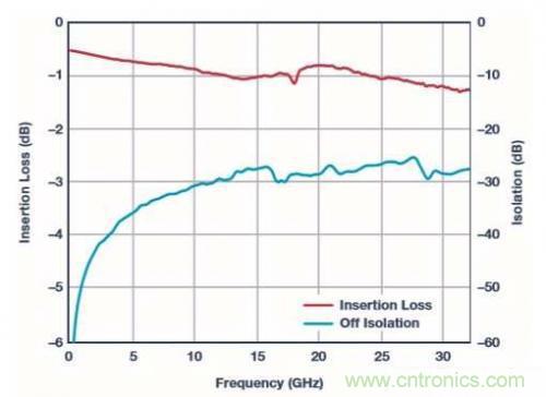 任何開關技術的最重要質量因子之一,就是單一開關的導通電阻乘以關閉電容。 通常會將此稱作RonCoff系數,并且以飛秒(femtoseconds)加以表示。 當RonCoff下降時,開關的插入損耗也會隨之減少,而關閉隔離就會獲得改善。 對于單一開關單元,ADI MEMS開關技術的RonCoff系數小于8,此將可以保證其做為技術選擇的地位,進而實現世界級的開關性能。