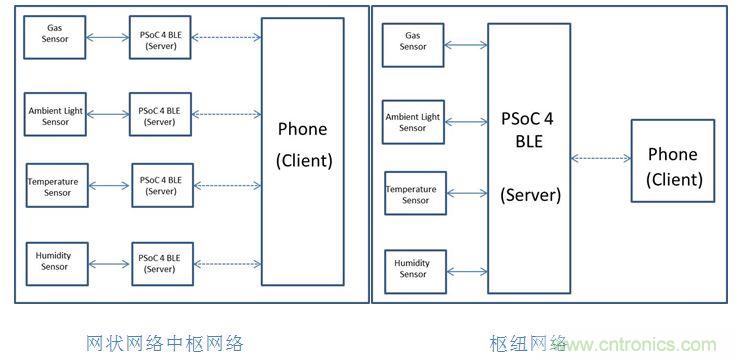 無線傳感器網絡通常作為網狀網絡和樞紐網絡(見圖1)。樞紐網絡包括可以放置在相同位置的所有傳感器。每個傳感器需要連接到單個BLE外圍設備(服務器)來處理數據并將其發送到BLE中央設備(客戶端)。網狀網絡采用可以遠程定位傳感器的拓撲結構。網格中的每個節點都需要連接到BLE外圍設備(服務器),所有這些外圍設備都可以連接到BLE中央設備(客戶端)。