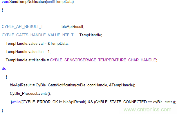 一旦兩個設備實現連接,就能使用連接間隔不同的通知發送數據。應用程序接口“CyBle_ProcessEvents()”應置于while(1)循環中,且必須在每個連接間隔中至少調用一次。我們也可以調用在同一while循環中將數據作為通知發送的函數。以下函數可用于將溫度數據的一個字節作為通知發送。這也適用于其他傳感器特性。