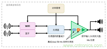 處理器執(zhí)行各種音頻處理功能,如解碼和信號均衡,同時也處理Wi-Fi和/或藍牙通信軟件堆棧。過去,CD品質的采樣頻率可能已足夠。但是今天的高保真音頻系統對信號鏈中的處理器提出了其它要求,因為高保真音質要求在24位音樂信號流中提供48kHz至192kHz范圍內的采樣率。