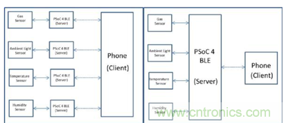 無線傳感器網絡通常作為網狀網絡和樞紐網絡(見圖1)。樞紐網絡包括可以放置在相同位置的所有傳感器。每個傳感器需要連接到單個BLE外圍設備(服務器)來處理數據并將其發送到BLE中央設備(客戶端)。網狀網絡采用可以遠程定位傳感器的拓撲結構。網格中的每個節點都需要連接到BLE外圍設備(服務器),所有這些外圍設備都可以連接到BLE中央設備(客戶端)。