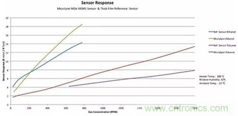 Micralyne對其MEMS MOS氣體傳感器的傳感響應,與傳統(tǒng)厚膜傳感器做了對比。在相對濕度32%,空氣中乙醇含量800ppm時,其MEMS MOS氣體傳感器達到和更大尺寸的厚膜傳感器(初始電阻和測試電阻比18:1)相近的靈敏度。對于所有的MOS傳感器,都必須考慮相對濕度,因為該參數(shù)也會影響傳感器的電阻變化。Micralyne的MEMS MOS氣體傳感器還可以探測600~2000 ppm的甲苯,初始電阻和測試電阻比高至8:1。其MEMS傳感器的響應時間小于1秒。并且,在氣流中移除被分析氣體后,電阻恢復速度要比傳統(tǒng)厚膜氣體傳感器快2倍。