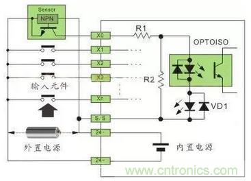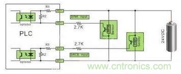 注:24VDC供電的傳感器,在輸入回路上需要串聯限流電阻,R1為10Ω,R2為2KΩ,不串聯限流電阻,將燒毀接口回路,限流電阻取值2.7KΩ。