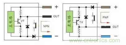 NPN型當傳感器有檢測信號VT導通,輸出端OUT的電流流向負極,輸出端OUT電位接近負極,通常說的高電平翻轉成低電平。
