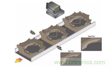 隨著過去幾年傳感技術(shù)的進(jìn)步,用戶現(xiàn)在能夠?qū)⒕哂谐杀拘б娴臏y量功能集成到他們的工藝中,分辨率高達(dá)0.0001英寸。在下一個(gè)制造步驟之前,可以自動(dòng)檢查零件的關(guān)鍵屬性。在圖示中,激光傳感器檢查在夾具中旋轉(zhuǎn)的鑄造輪,以確保在加工之前沒有空隙或過多的跳動(dòng)。