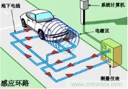 目前,道路檢測交通流狀態(tài)用的最多的傳感器件是環(huán)形線圈,它可以檢測交通量、車速、占有率、車頭時距、車長、長車比和車輛存在等多個項(xiàng)目。環(huán)形線圈檢測原理如圖所示。線圈由專用電纜繞幾匝(一般為4匝)及其饋線構(gòu)成,它通過一個變壓器接到被恒流源支持的調(diào)諧回路,有源環(huán)形線圈構(gòu)成LC調(diào)諧回路的電感部分,并在線圈周圍的空間產(chǎn)生電磁場。當(dāng)含有鐵金屬的車體進(jìn)入線圈磁場范圍,車輛鐵構(gòu)件內(nèi)產(chǎn)生自成閉回路的感應(yīng)電渦流,此渦流又產(chǎn)生與原有磁場方向相反的新磁場,導(dǎo)致線圈的總電感變小,引起調(diào)諧頻率偏離原有數(shù)值,從而發(fā)出車輛通過或存在的信號。