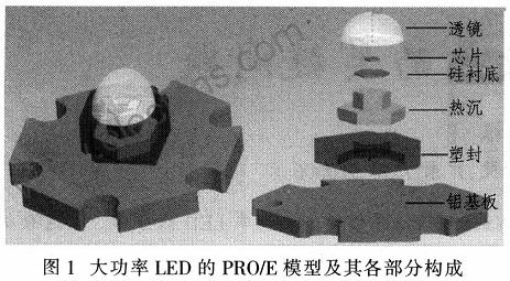 圖1為依據(jù)常見1w大功率LED尺寸建立并簡化、海鷗翼封裝鋁熱沉的大功率LED圖形,底座接在MCPCB鋁基板上。主要數(shù)據(jù):芯片尺寸為1mm×1mm×O.25mm,透鏡為直徑是13mm的半球。硅襯底為邊長17mm,高0.25mm的正六棱柱,MCPCB為直徑20mm,高1.75mm的六角星形鋁質(zhì)基板。