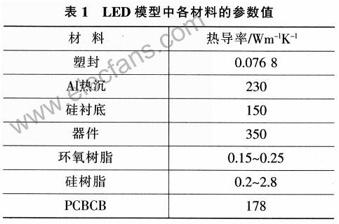 LED輸入功率為1W,光效率取10%;封裝體外部的各組件(包括MCPCB、陶瓷封裝、熱沉的外部)通過與空氣的對流散熱;器件與外界的熱對流系數(shù)為20。工作環(huán)境溫度為25℃;器件滿足使用ANSYS軟件進行穩(wěn)態(tài)有限元熱分析的條件;最大結(jié)溫選擇為125℃。各種材料的參數(shù)如表1所示。