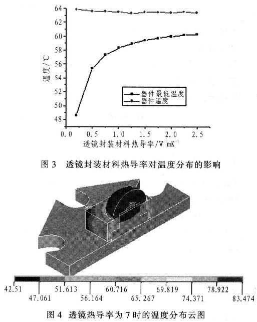 只考慮熱傳導與對流,改變不同封裝填充材料如硅樹脂.得出結(jié)果,如圖3所示。即使找到一種熱導率高達7Wm-1K-1的環(huán)氧樹脂成分封裝材料時,相比使用熱導率為0.25Wm-1K-1的環(huán)氧樹脂成分封裝材料時,芯片溫度下降不多,鋁基板溫度只下降了2.271℃,最大功率僅提高了0.69W。實際上,熱導率值超過7Wm-1K-1以上、可商業(yè)化的透明硅樹脂封裝材料目前尚無文獻報導。分布云圖如圖4所示。
