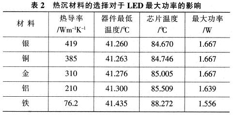 表2給出透鏡熱導率為0.2Wm-1K-1時,不同熱沉材料的導熱系數(shù)對于LED最大功率影響。由表2看出,熱沉材料對于LED的最大散熱能力的影響很小。[page]