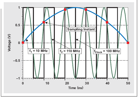 圖 1 100MSPS 采樣的兩個(gè)輸入信號顯示了混疊帶來的相同采樣點(diǎn)