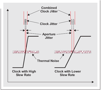 我們在產(chǎn)品說明書中可以找到 ADC 的孔徑口抖動(dòng) (aperture jitter)。這一值一般與時(shí)鐘振幅或轉(zhuǎn)換速率一起指定,記住這一點(diǎn)很重要。低時(shí)鐘振幅帶來低轉(zhuǎn)換速率,從而增加窗口抖動(dòng)。