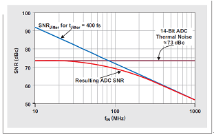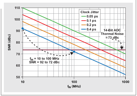 讓我們來對一個(gè)具有 400 fs 抖動(dòng)時(shí)鐘電路和 ~73 dB 熱噪聲的 14 位 ADC 進(jìn)行分析。低輸入頻率(例如:10MHz 等)下,該 ADC 的 SNR 主要由其熱噪聲定義。由于輸入頻率增加,400-fs 時(shí)鐘抖動(dòng)越來越占據(jù)主導(dǎo),直到 ~300 MHz 時(shí)完全接管。盡管相比 10MHz 的 SNR,100MHz 輸入頻率下時(shí)鐘抖動(dòng)帶來的 SNR 每十倍頻降低 20dB,但是總 SNR 僅降低 ~3.5 dB(降至 69.5dB),因?yàn)榇嬖?73-dB 熱噪聲(請參見圖 5):