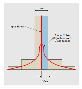 在采樣過程中,輸入信號與采樣時(shí)鐘信號混頻在一起,包括其相位噪聲。當(dāng)進(jìn)行輸入信號 FFT 分析時(shí),主 FFT 容器 (bin) 集中于輸入信號。采樣信號周圍的相位噪聲(來自時(shí)鐘或輸入信號)決定了鄰近主容器的一些容器的振幅,如圖 7 所示。因此,小于 1/2 容器尺寸的偏頻的所有相位噪聲都集中于輸入信號容器中,且未增加噪聲。因此,相位噪聲整合帶寬下限應(yīng)設(shè)定為 1/2 FFT 容器尺寸。 FFT 容器尺寸計(jì)算方法如下: