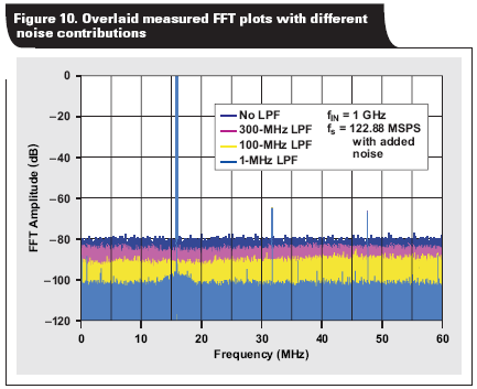 該實(shí)驗(yàn)表明,時(shí)鐘相位噪聲必需非常低或者帶寬有限,較為理想的情況是通過一個(gè)很窄的帶通濾波器。否則,由系統(tǒng)時(shí)鐘帶寬設(shè)定的整合上限會(huì)極大降低 ADC 的 SNR。